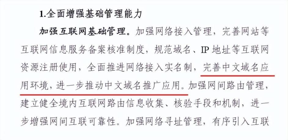 数商引擎了解到,近年来,国家积极鼓励和支持中文域名系统的技术研究和推广应用。国务院办公厅印发的《政府网站发展指引》和工信部发布的《互联网域名管理办法》都提到了中文域名的推广应用。2021年11月,工业和信息化部发布的《“十四五”信息通信产业发展规划》中也明确指出,“完善中文域名应用环境,进一步推动中文域名推广应用”。5月25日,中国互联网协会携手北京师范大学新闻传播学院联合举办互联网治理与中文域名系列讲座,以“互联网普遍适用与中文域名”为主题介绍了中文域名的缘起、实现和挑战,引导青年人正确面对和认识互联网。